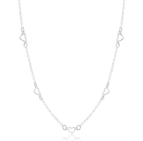 Colar Choker de Prata Corações Pequenos Vazados. Ela tem cinco corações pequenos em volta, prontos pra dar um charme todo especial no seu look e te deixar ainda mais linda e maravilhosa. A corrente é modelo de elos bem delicada do jeitinho que nós amamos.